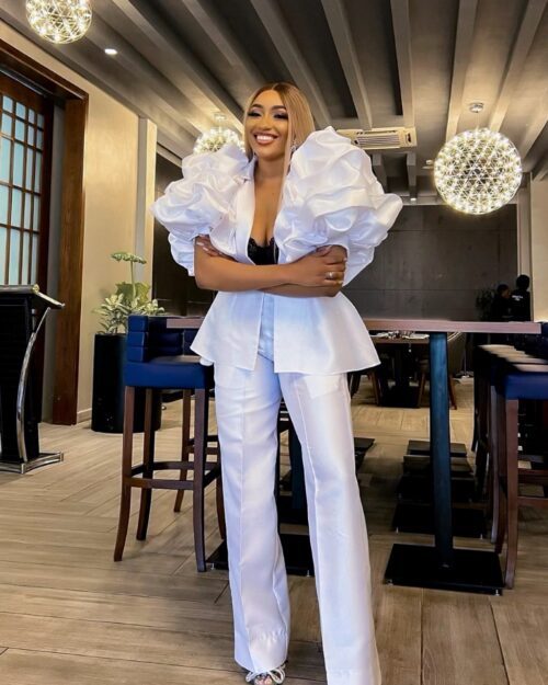 Two-toned Sheer off-shoulder top and side pleat pants. See the STYLE 2.