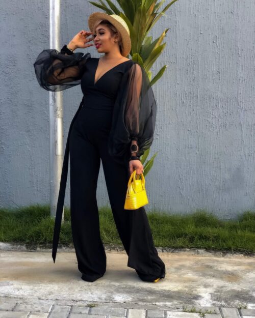 Jumpsuit with exaggerated sheer sleeves and an attached belt that can be knitted into a bow. Please click on "our size guide", to ensure you choose the right size.