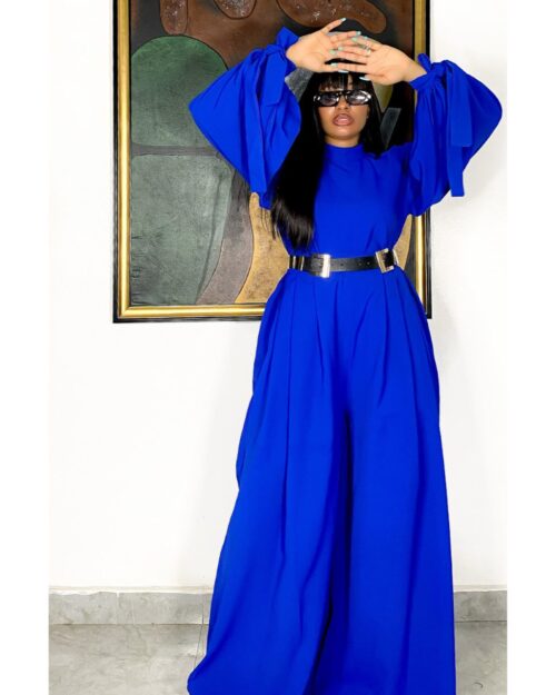 Wide leg pants and crop top with exaggerated sleeves. This pair sits perfectly it could pass for a jumpsuit!