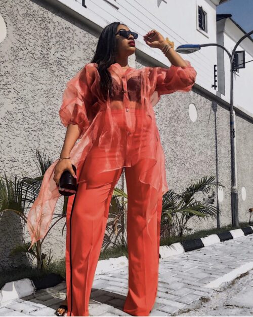 Sheer shirt and crepe pant set. Please click on "our size guide", to ensure you choose the right size.