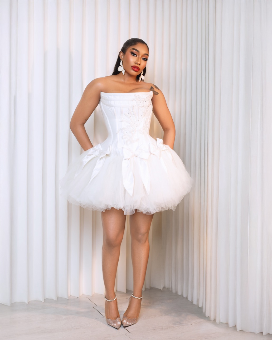 A fairy-tale princess–inspired corset mesh dress that accentuates the curves, complemented by accessories adorned with intricate hand-beaded details.