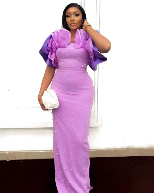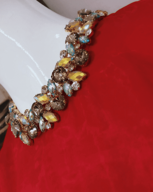 Statement glam dress with pearl details and back slit. The length of the dress on display is 65inches.