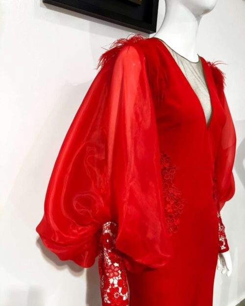 Pretty mini statement dress, With detailed bottom ruffles and exaggerated sleeves.